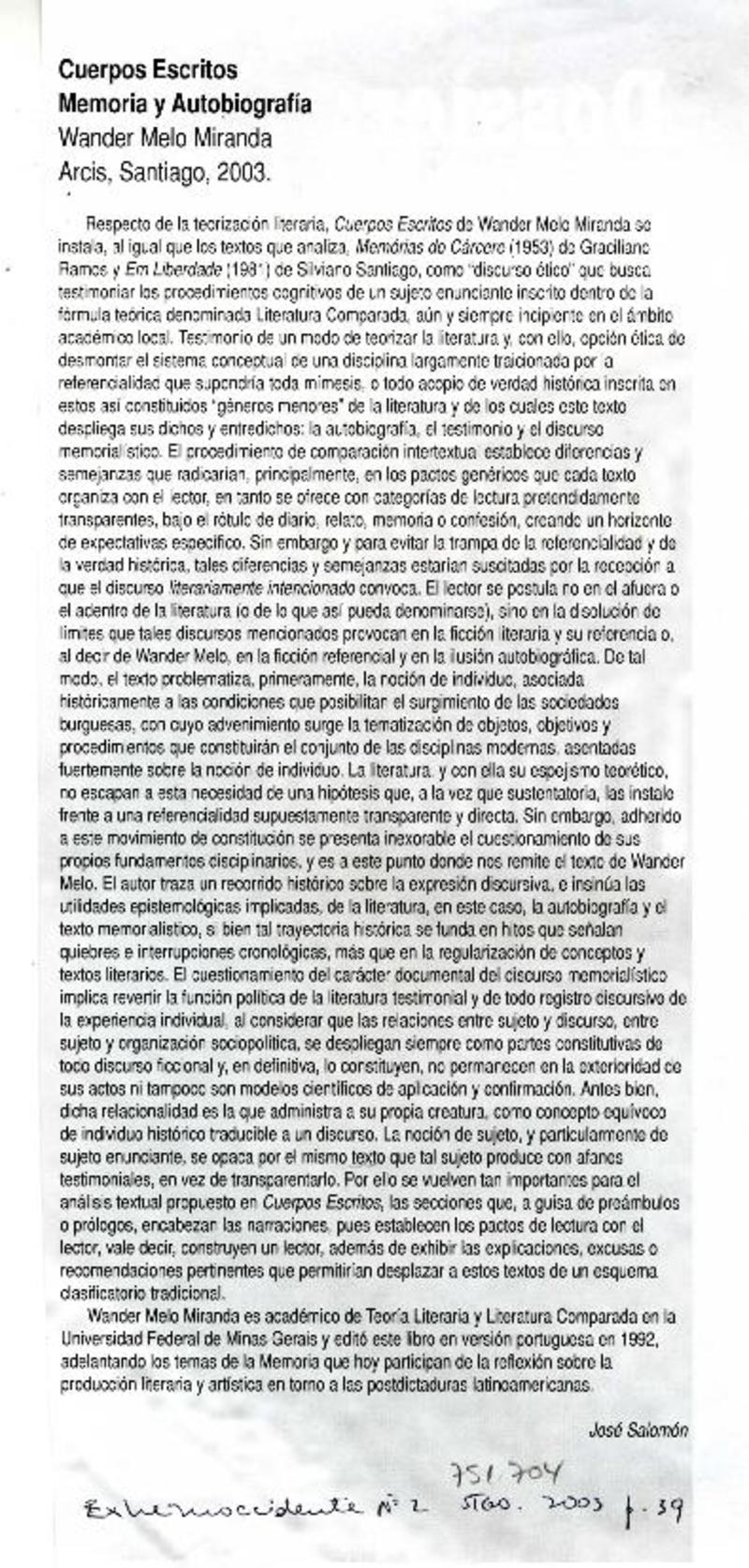 Cuerpos escritos memoria y autobiografía [artículo] José Salomón.