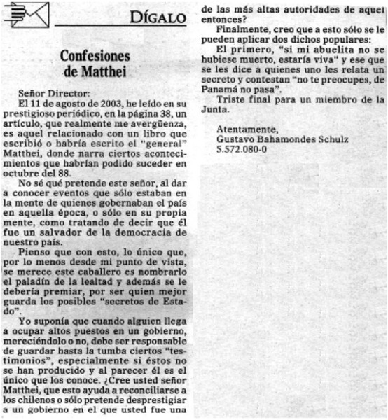Confesiones de Matthei [artículo] Gustavo Bahamondes Schulz.