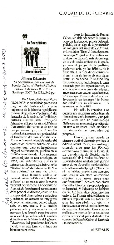 Alberto Edwards: La Secretísima. Los cuentos de Román Calvo, el Sherlock Holmes chileno [artículo] Australis.