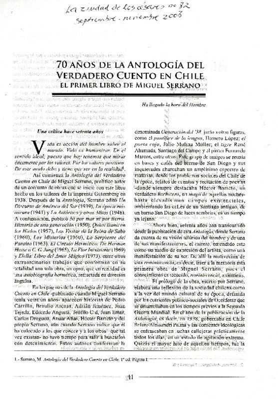 70 años de la antología del verdadero cuento en Chile: el primer libro de Miguel Serrano [artículo] Rafael Videla Eissmann.