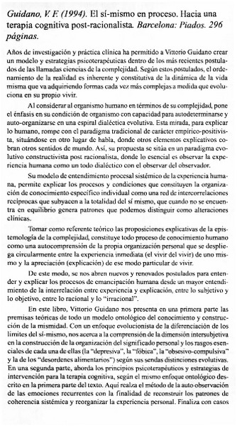 Guidano, V. F. (1994). El sí mismo en proceso. Hacia una terapia cognitiva post-racionalista [artículo] Sergio Manosalva Mena.