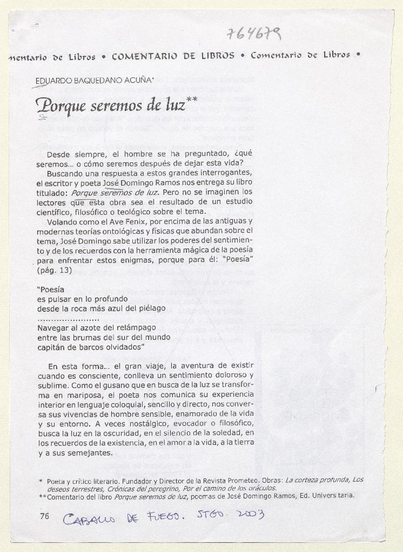 Porque seremos de luz [artículo] Eduardo Baquedano Acuña.