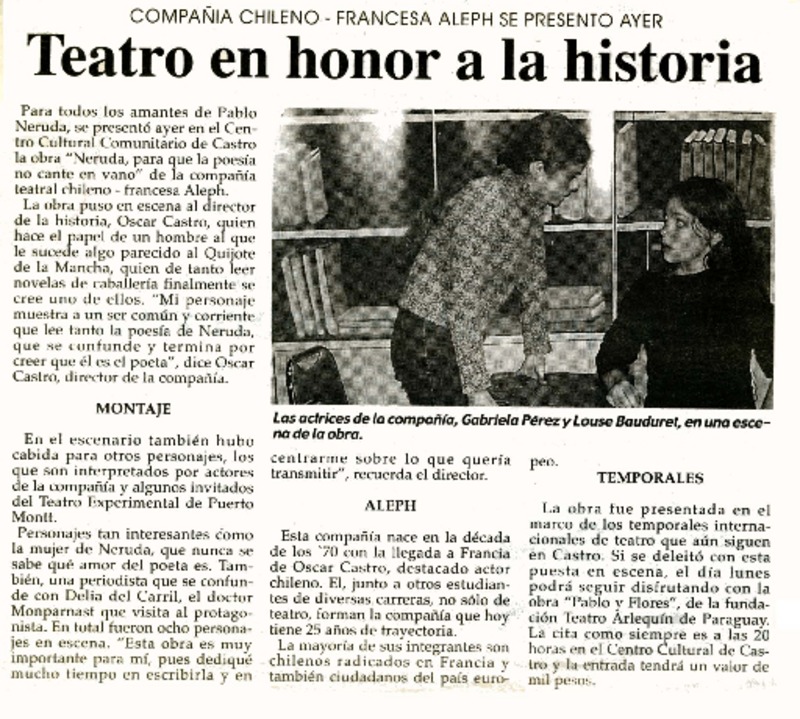 Teatro en honor a la historia Compañía Chileno-francesa ALEPH se presento ayer [artículo] :
