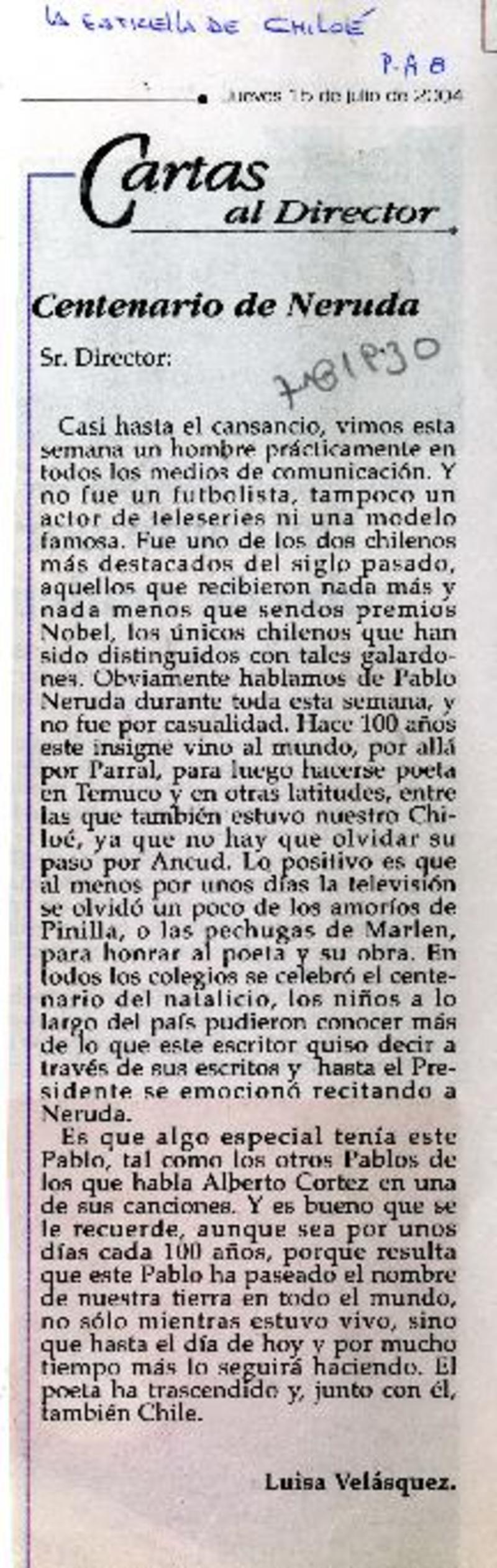 Centenario de Neruda [artículo] Luisa Velásquez.