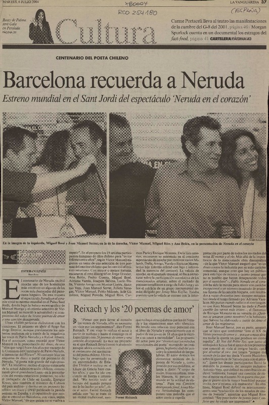Barcelona recuerda a Neruda Estreno mundial en el Saint Jordi del espectáculo "Neruda en ele corazón" [artículo] :