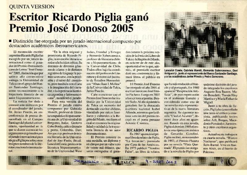 Escritor Ricardo Piglia ganó Premio José Donoso 2005 [artículo].