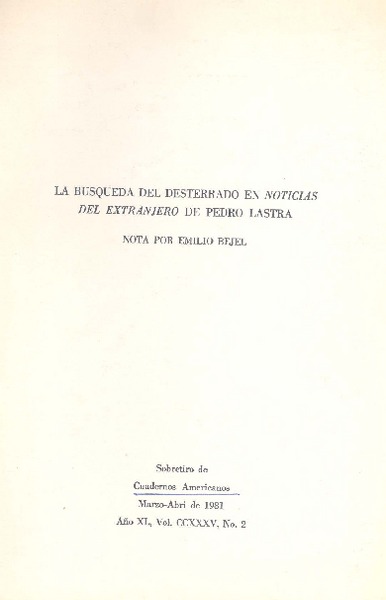 La búsqueda del desterrado en Noticias del extranjero de Pedro Lastra [artículo] Emilio Bejel.