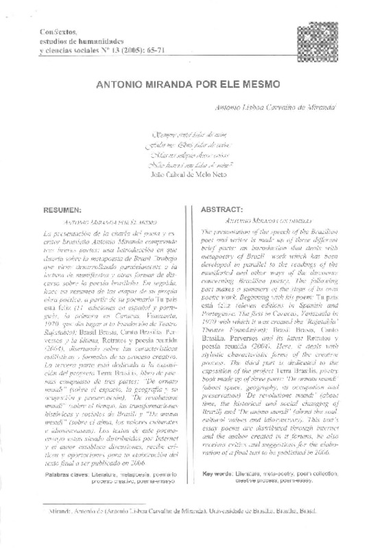 Antonio Miranda por ele mesmo [artículo] Antonio Lisboa Carvalho de Miranda.
