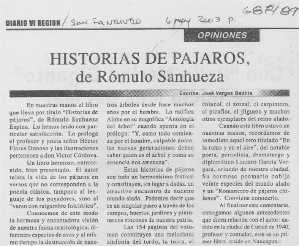 Historias de pájaros, de Rómulo Sanhueza [artículo] José Vargas Badilla.