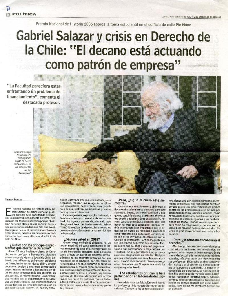 Gabriel Salazar y crisis en Derecho de la Chile "El decano está actuando como patrón de empresa" [entrevista] [artículo] : Melissa Forno.