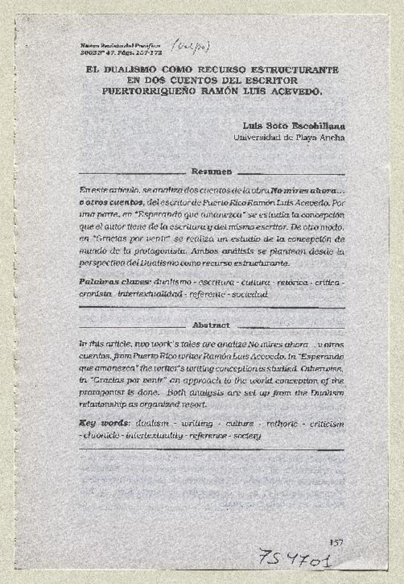 El dualismo como recurso estructurante en dos cuentos del escritor puertorriqueño Ramón Luis Acevedo [artículo] Luis Soto Escobillana.