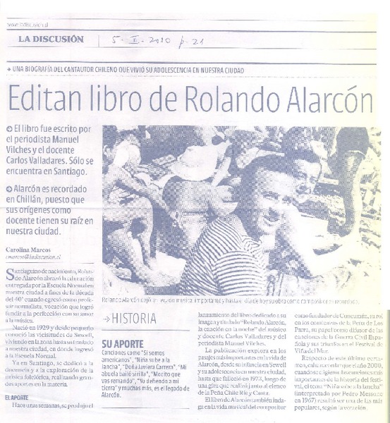 Editan libro de Rolandro Alarcón [artículo] Carolina Marcos.
