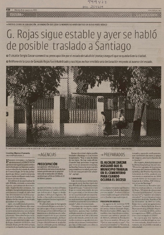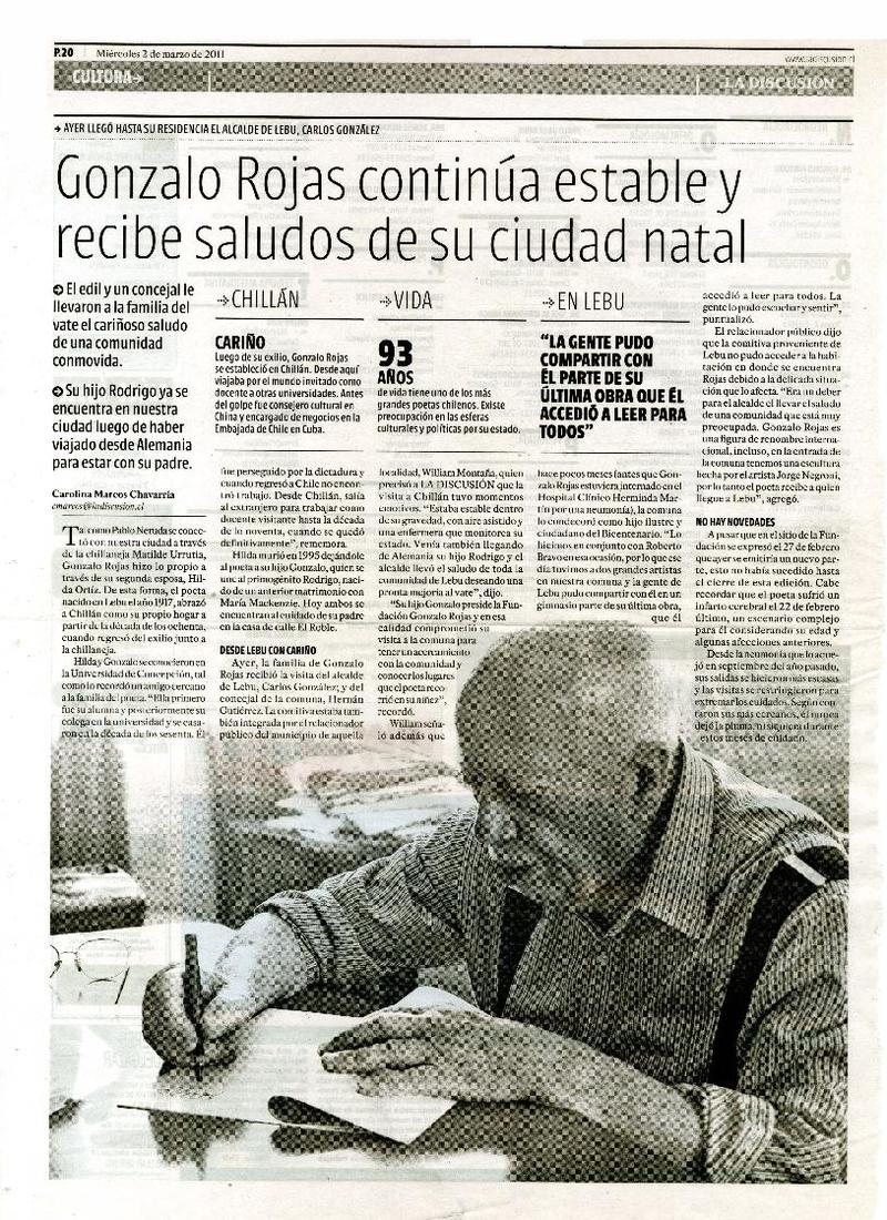 Gonzalo Rojas continúa estable y recibe saludos de su ciudad natal [artículo] Carolina Marcos Chavarría.