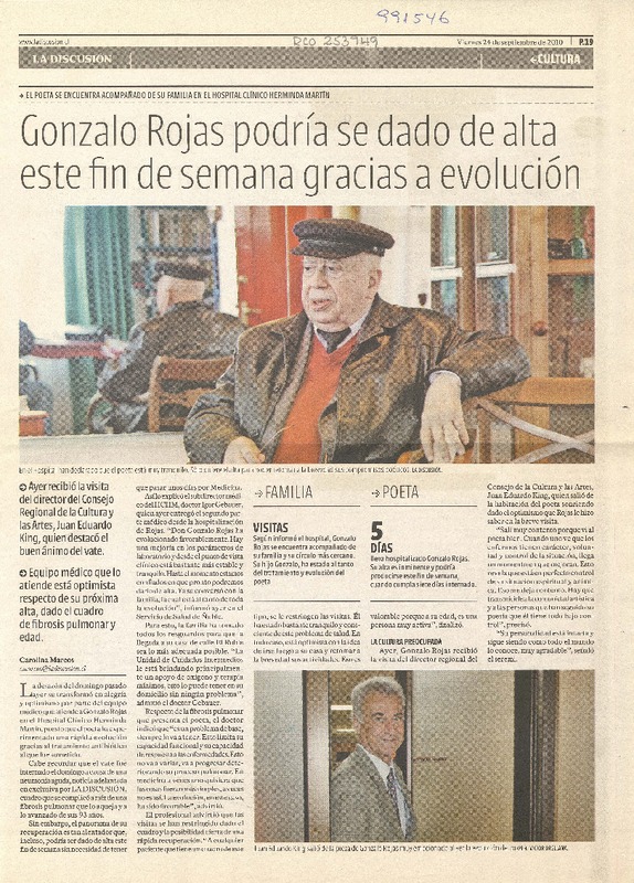 Gonzalo Rojas podría ser dado de alta este fin de semana gracias a evolución [artículo] Carolina Marcos.