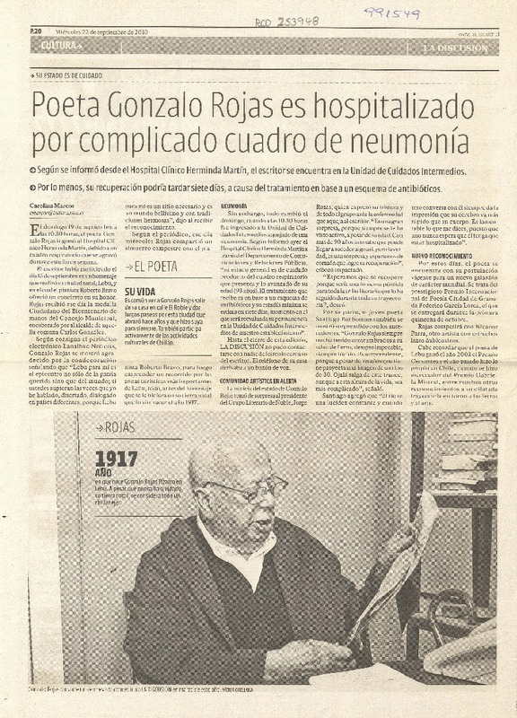 Poeta Gonzalo Rojas es hospitalizado por complicado cuadro de neumonía [artículo] Carolina Marcos.