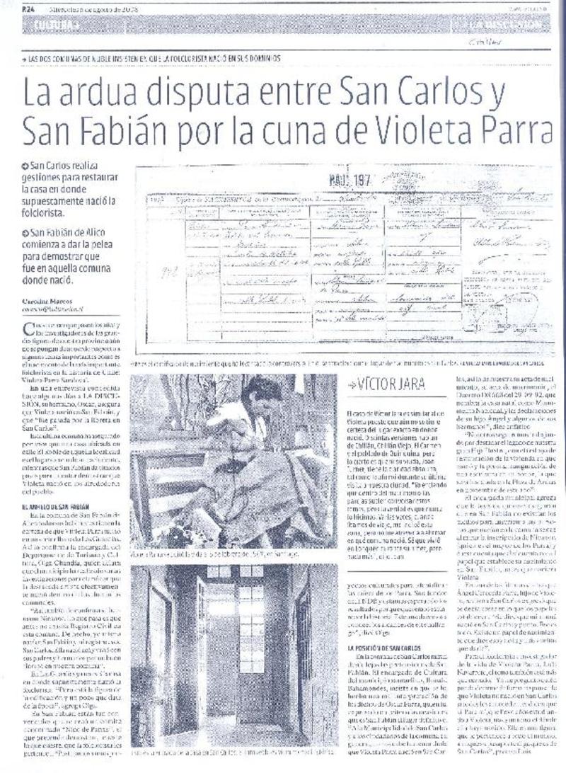 La ardua disputa entre San Carlos y San Fabián por la cuna de Violeta Parra [artículo] Carolina Marcos.