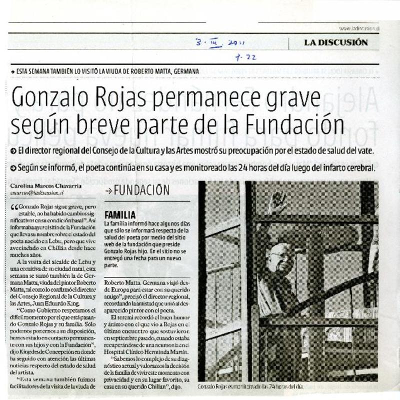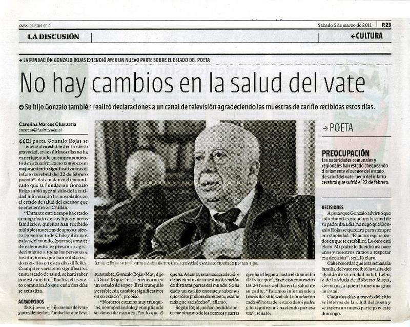 Gonzalo Rojas permanece grave según breve parte de la Fundación [artículo] Carolina Marcos Chavarría.