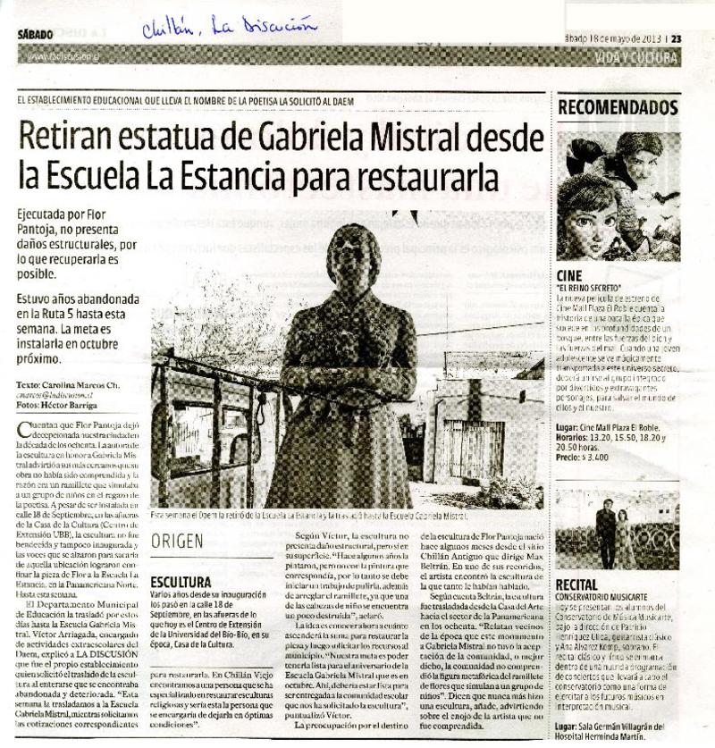Retiran estatua de Gabriela Mistral desde la escuela La Estancia para restaurarla [artículo] Crolina Marcos.