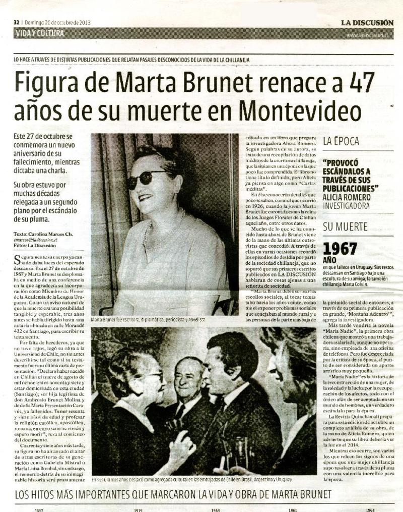 Figura de Marta Brunet renace a 47 años de sum uerte en Montevideo [artículo] Carolina Marcos Ch.