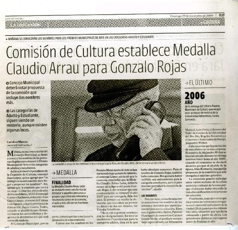 Comisión de cultura establece medalla Claudio Arrau para Gonzalo Rojas [artículo] Carolina Marcos.