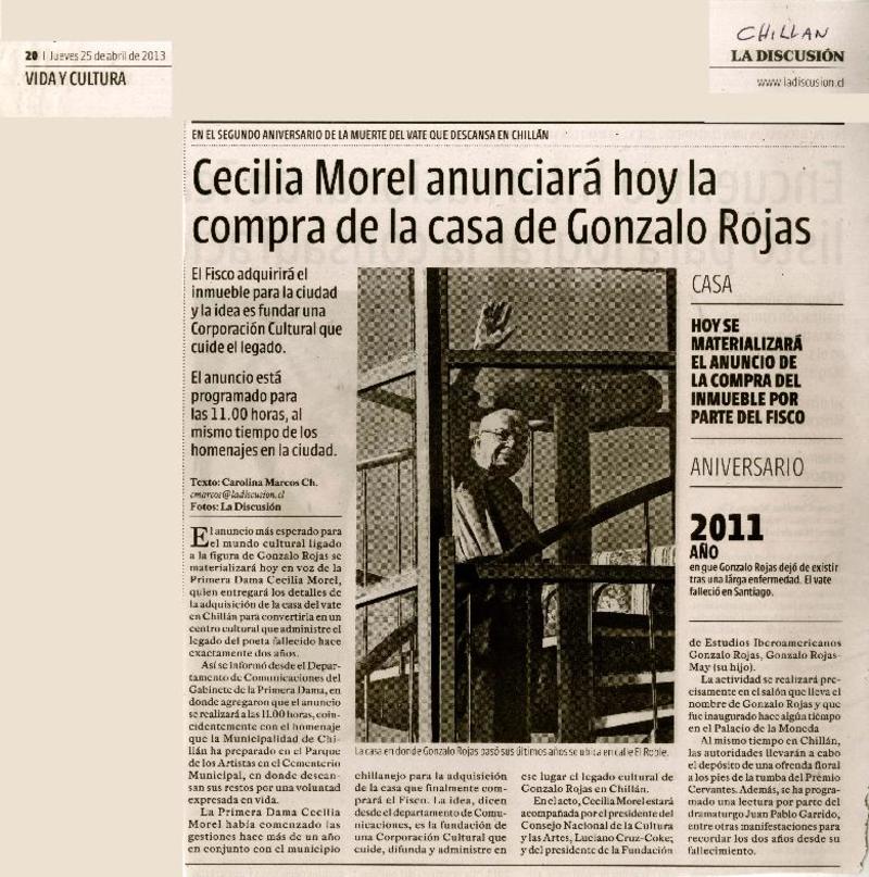 Cecilia Morel anunciará hoy la compra de la casa de Gonzalo Rojas [artículo] Carolina Marcos Ch.