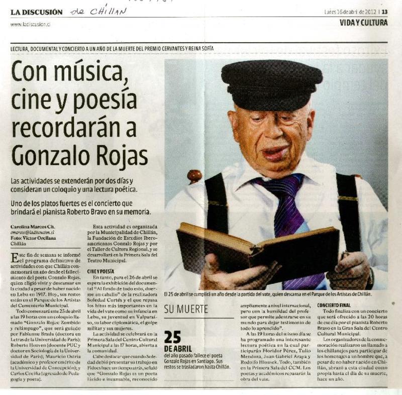 Con música, cine y poesía recordarán a Gonzalo Rojas [artículo] Carolina Marcos.