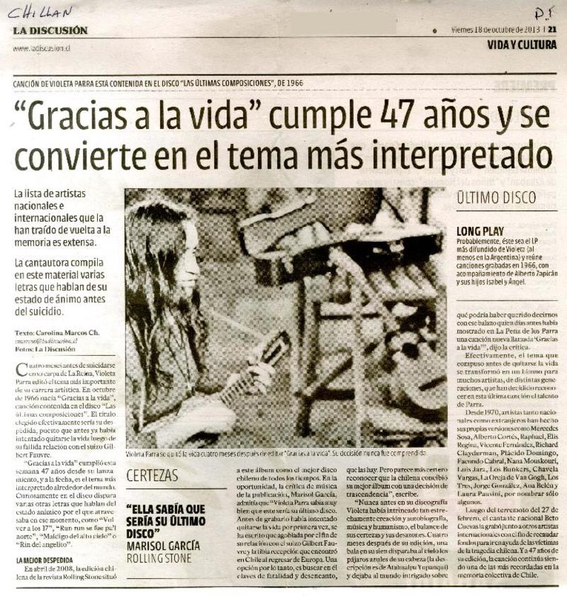 "Gracias a la vida" cumple 47 años y se convierte en el tema más interpretado [artículo] Carolina Marcos Ch.