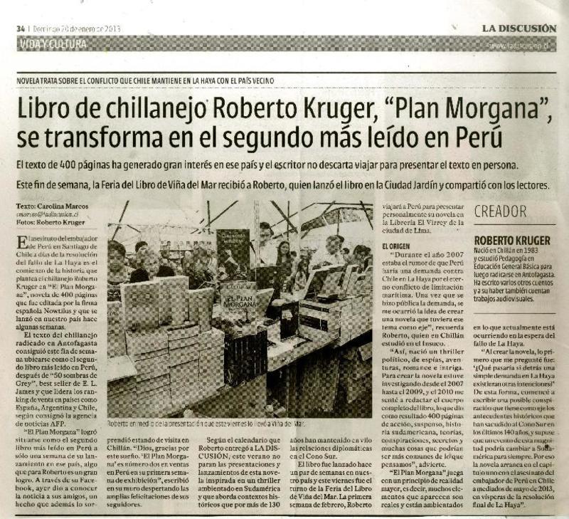 Libro de chillanejo Roberto Kruger, "plan Morgana", se transforma en el segundo más leído en Perú [artículo] Carolina Marcos.