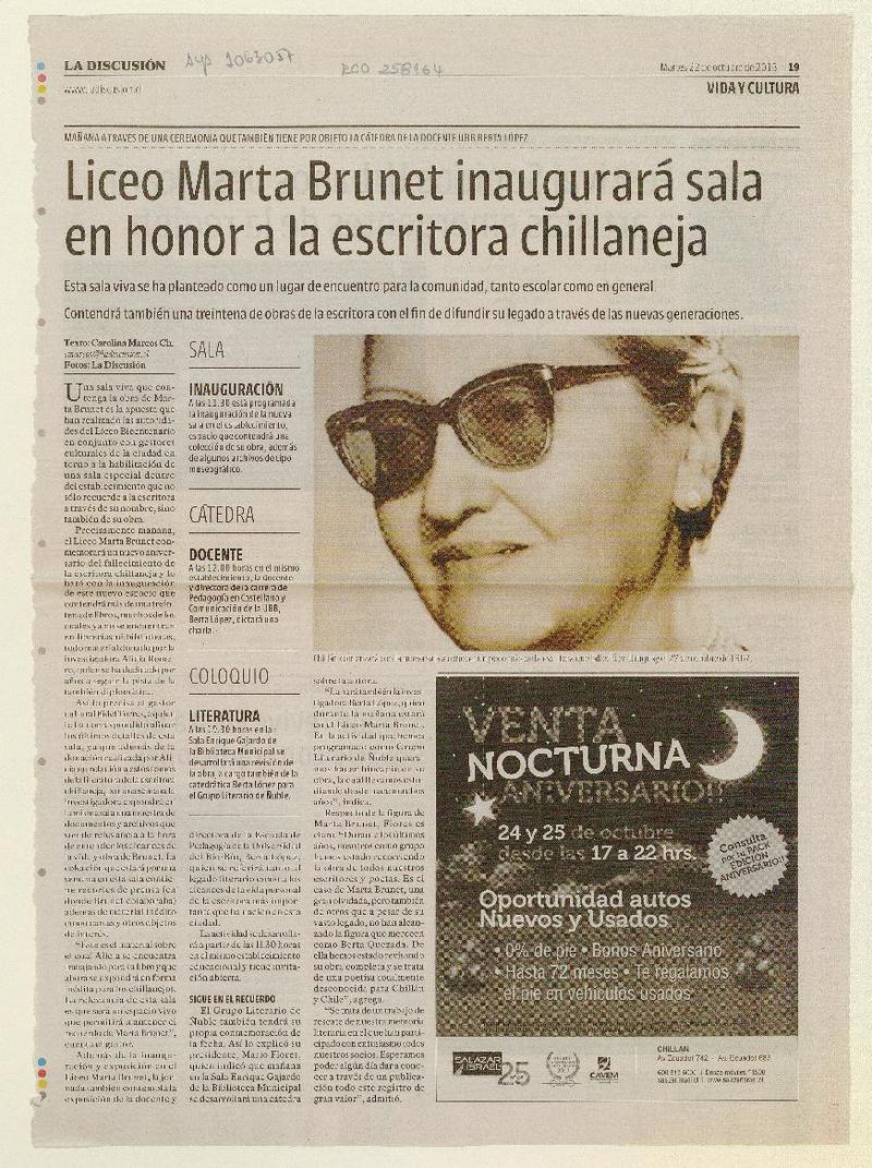 Liceo Marta Brunet inaugarará sala en honor a la escritora chillaneja [artículo] Carolina Marcos Ch.