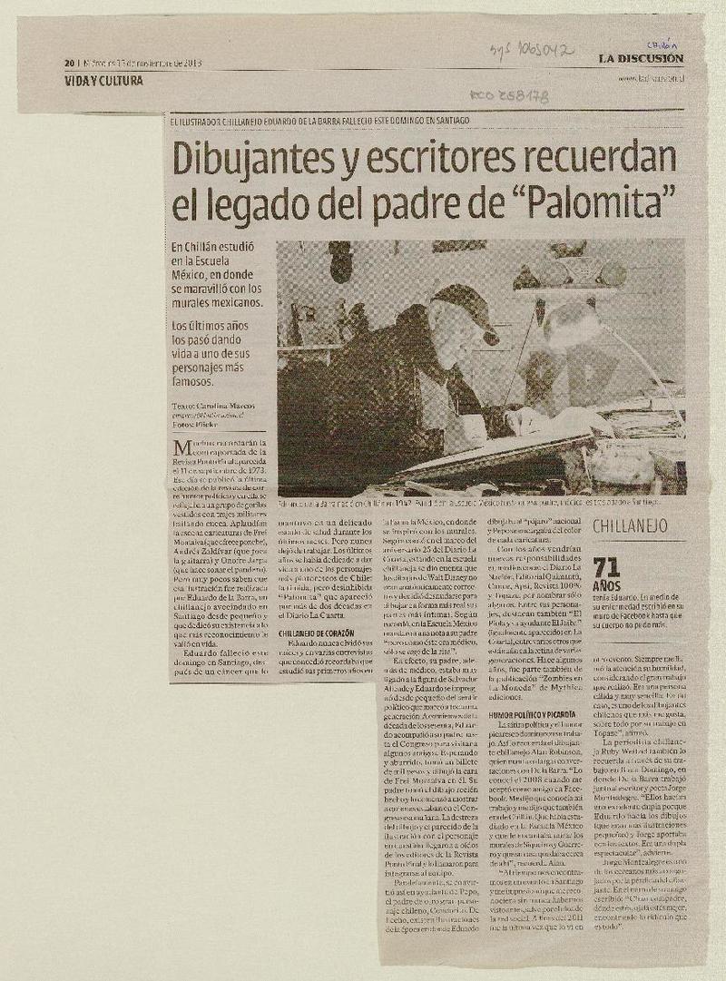 Dibujantes y escritores recuerdan el legado del padre de "Palomita" [artículo] Carolina Marcos Ch.