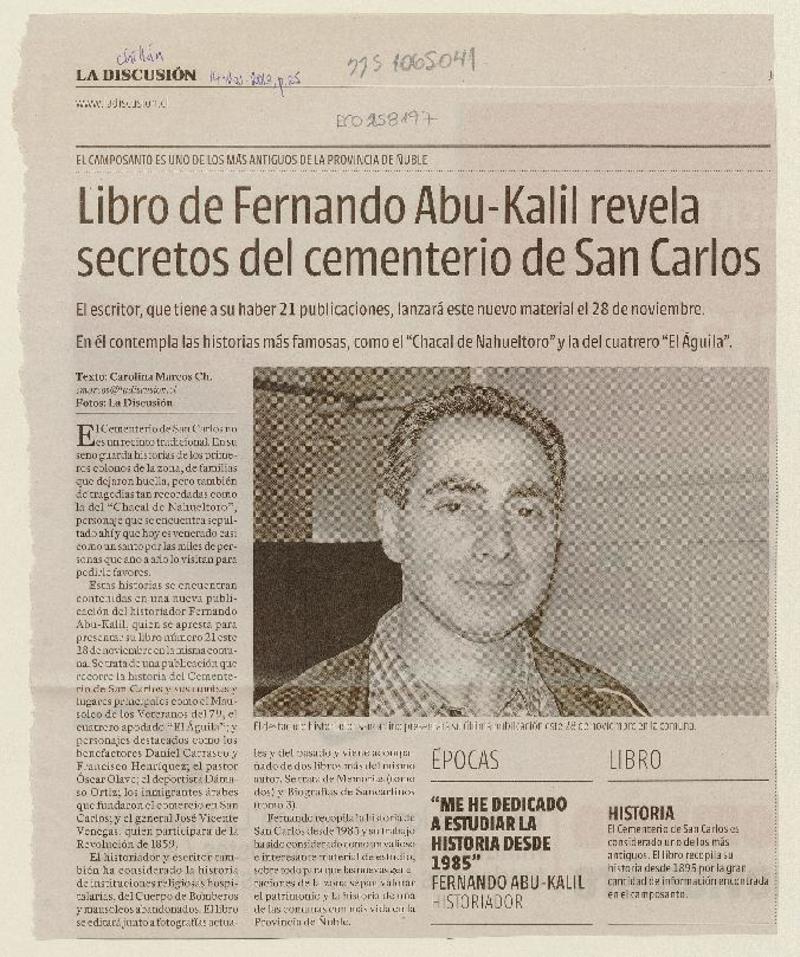 Libro de Fernando Abu-Kalil revela secretos del cementerio de San Carlos [artículo] Carolina Marcos Ch.
