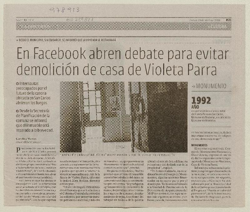En Facebook abren debate para evitar demolición de casa de Violeta Parra [artículo] Carolina Marcos.