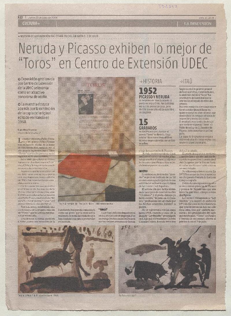 Neruda y Picasso exhiben lo mejor de "Toros" en Centro de Extensión UDEC [artículo] Carolina Marcos.
