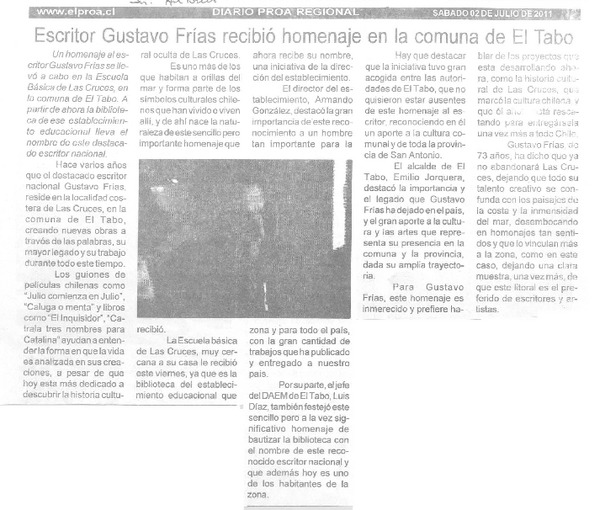 Escritor Gustavo Frías recibió homenaje en la comuna de El Tabo [artículo]