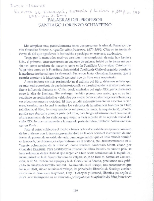 Palabras de Profesor Santiago Lorenzo Schiaffino. [artículo]
