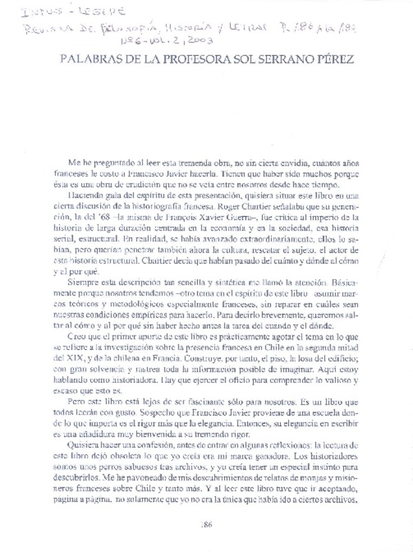 Palabras de la profesora Sol Serrano Pérez. [artículo]