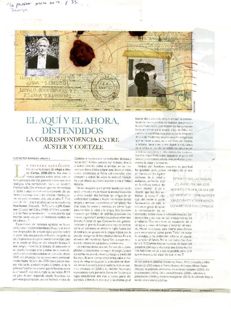 El aquí y el ahora, distendidos : la correspondencia entre Auster y Coetzee [artículo] Víctor Barrera Enderle.