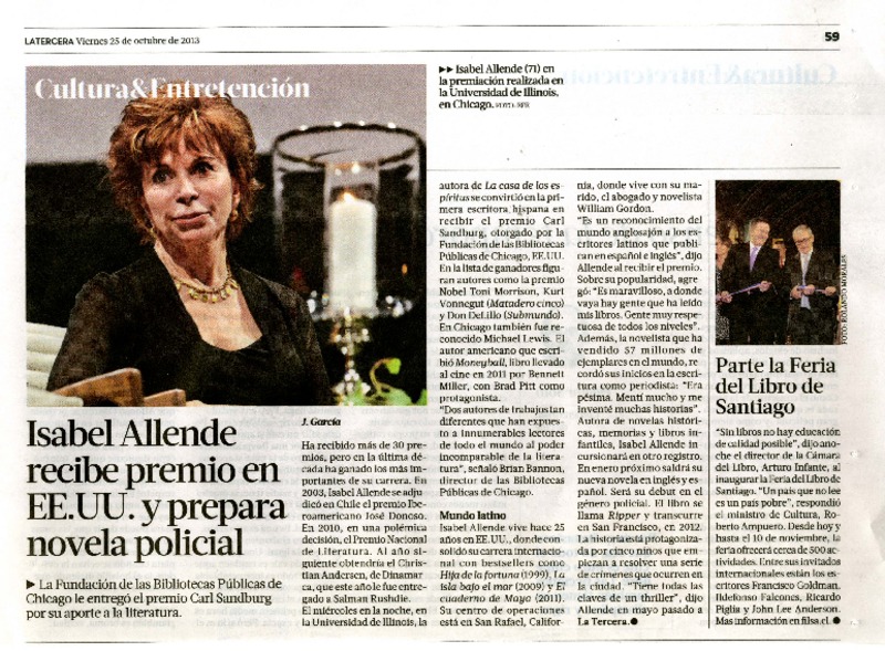 Isabel Allende recibe premio en EE.UU. y prepara novela policial [artículo] J. Garcia.