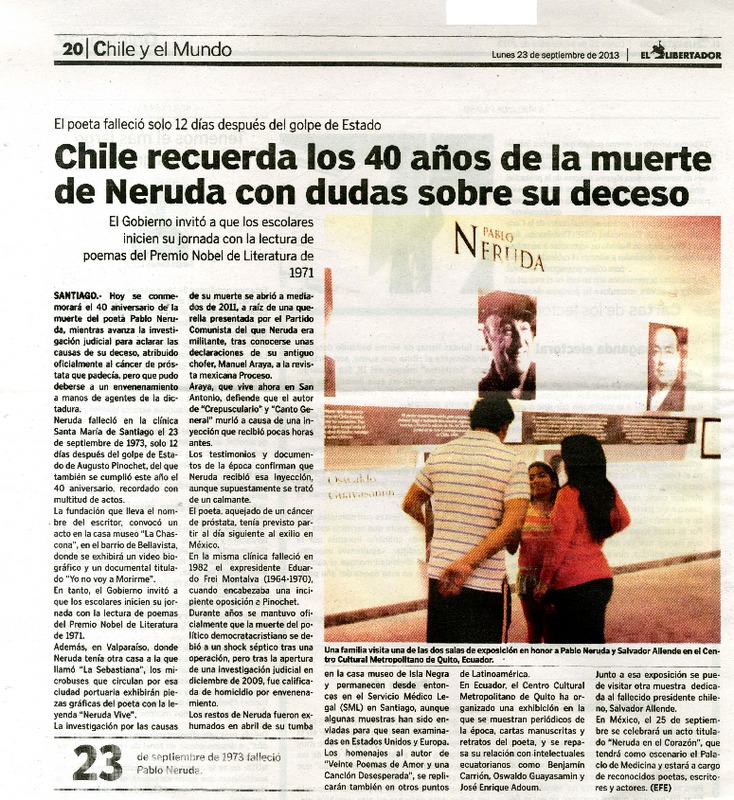 Chile recuerda los 40 años de la muerte de Neruda con dudas sobre su deceso [artículo]