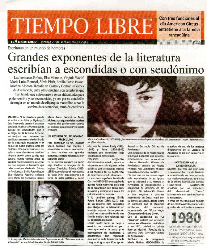 Grandes exponentes de la literatura escribían a escondidas o con seudónimo [artículo] Carmen Sigüenza