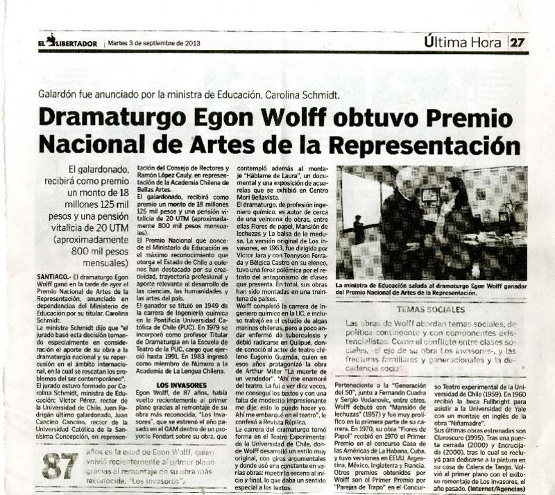 Dramaturgo Egon Wolff obtuvo Premio Nacional de Arte de la Representación [artículo]
