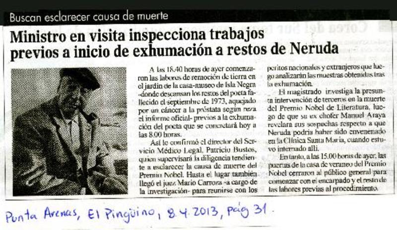 Ministro en visita inspecciona trabajos previos a inicio de exhumación a restos de Neruda. [artículo]