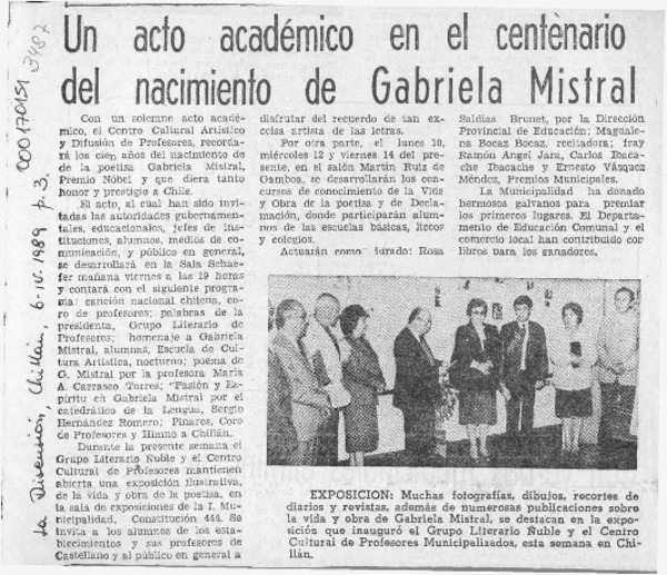 Un Acto académico en el centenario del nacimiento de Gabriela Mistral [artículo].