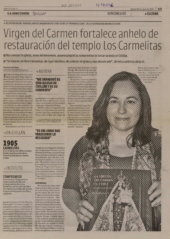 Virgen del Carmen fortalece anhelo de restauraciòn del templo los Carmelitas [artículo] Patricia Orellana.