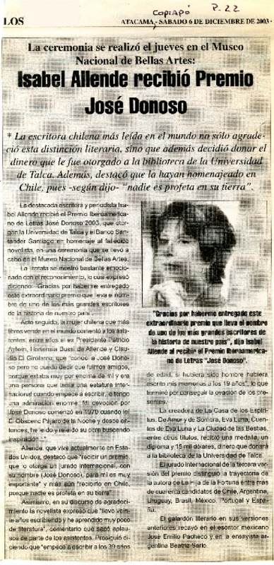 Isabel Allende recibió Premio José Donoso [artículo].