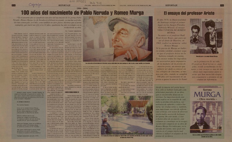 100 años del nacimiento de Pablo Neruda y Romeo Murga [artículo] Tussel Caballero.