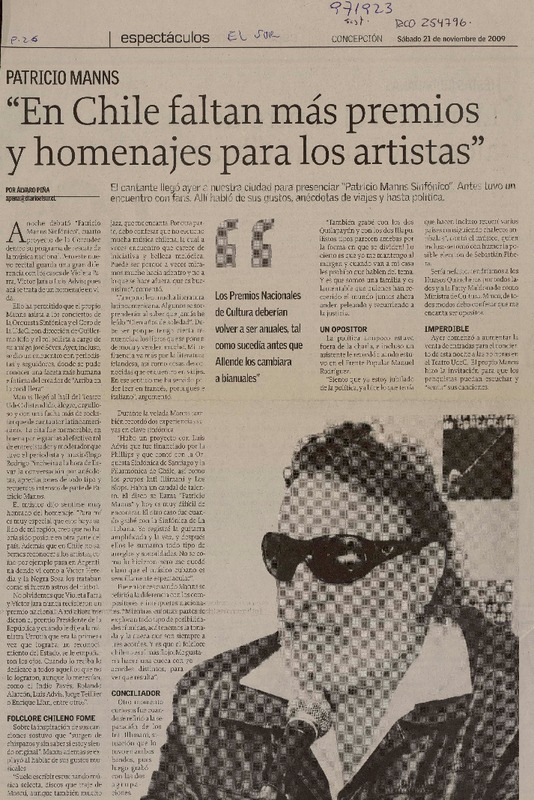 "En Chile faltan más premios y homenajes para los artistas" [artículo] Álvaro Peña.