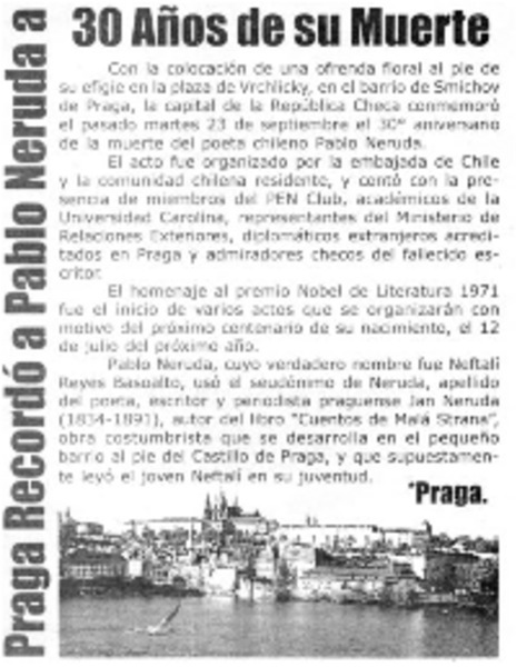 Praga recordó a Pablo Neruda a 30 años de su muerte. [artículo]