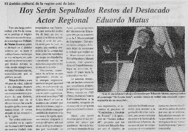 Hoy serán sepultados restos del destacado actor regional Eduardo Matus. [artículo]