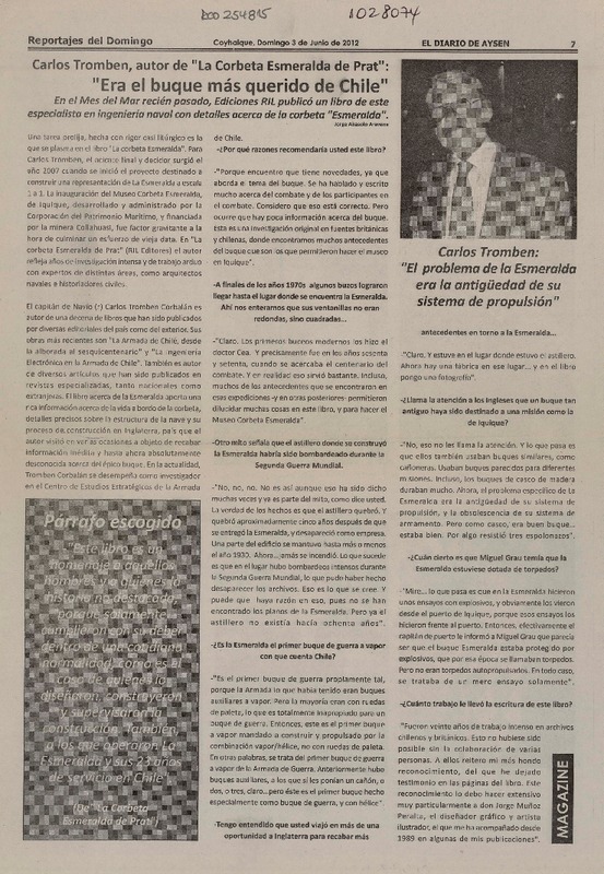 Autores chilenos - Corberta Esmeralda de Prat - Tromben Corbalán, Carlos - Entrevistas